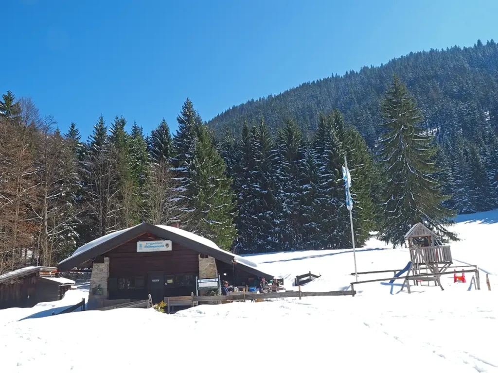 Vom Parkplatz der Wallbergbahn führt ein breiter Forstweg direkt in den dichten Wald. Nach dem Überqueren der Skiroute erreicht man nach 15 Minuten eine Weggabelung und folgt dem ausgewiesenen Winterweg rechts zur Wallbergmoosalm. Der schmale Weg steigt moderat an und führt nach rund einer Stunde Gehzeit zur auf 1117 Metern gelegenen Wallbergmoosalm.